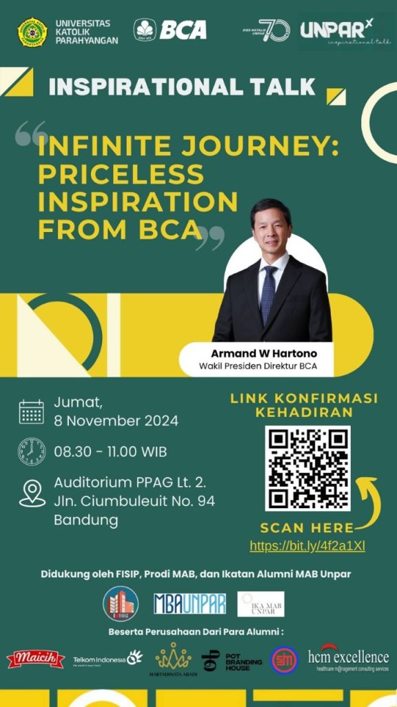 Universitas Katolik Parahyangan (UNPAR) bekerja sama dengan BCA menyelenggarakan acara diskusi inspiratif bertajuk “Endless Journey: Priceless Inspiration from BCA”. Acara tersebut menghadirkan Executive Vice President BCA Armand W. Hartono yang berbagi wawasan dan pengalamannya dalam memimpin salah satu bank terbesar di Indonesia.