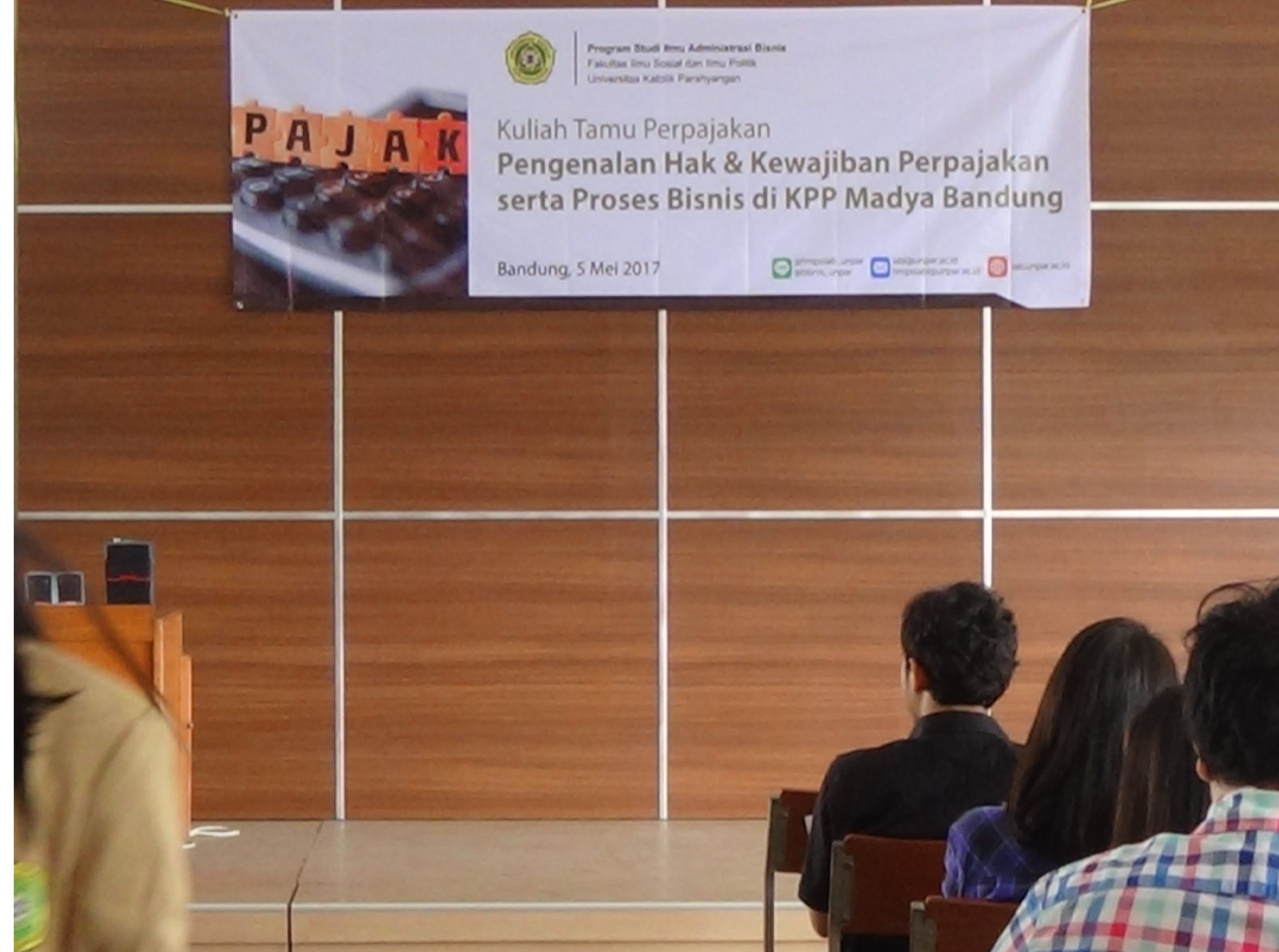 Pada hari Jumat, 5 Mei 2017. Para mahasiswa Ilmu Administrasi Bisnis UNPAR berkesempatan untuk memperoleh kuliah tamu perpajakan dari KPP Madya Bandung.