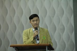 seluruh peserta bersama dosen dan pembicara sedang mengabadikan kegiatan seminar