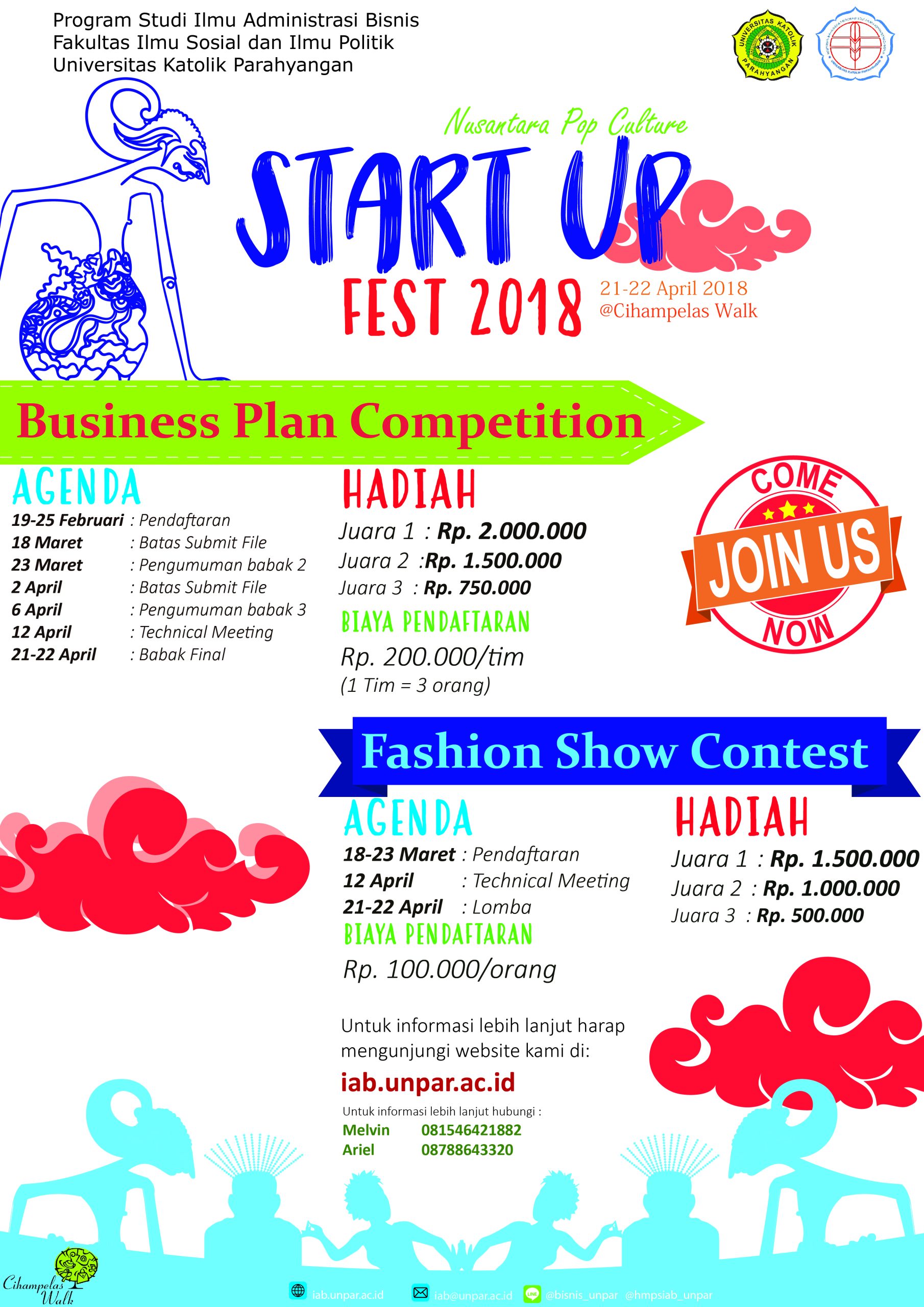 Program Studi Ilmu Administrasi Bisnis, Fakultas Ilmu Sosial dan Ilmu Politik Universitas Katolik Parahyangan mengadakan acara Start-Up Fest 2018 yang selalu diadakan setiap tahun. Start-Up Fests 2018 diselenggarakan dari kesadaran akan pentingnya kewirausahan bagi generasi muda. Oleh karenanya, dalam kegiatan ini, diadakan berbagai rangkaian acara yang diantaranya adalah perlombaan Business Plan dan Fashion Show yang ditujukan kepada pelajar SMA di Bandung.